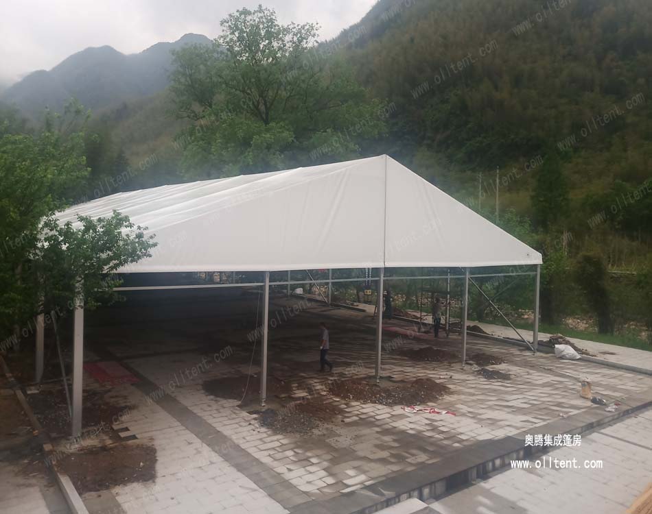 應該景區要求,我公司為該廣場搭建一套白色篷房景區內供當地以及游客觀看文藝演出及匯報工作,此篷房跨度為15變19米,邊高4米,占地530平方,為了融入周圍環境,突出自然環境,我公司頂布采用白色不透光篷布,四周無圍布,內部無立柱,可自由發揮。