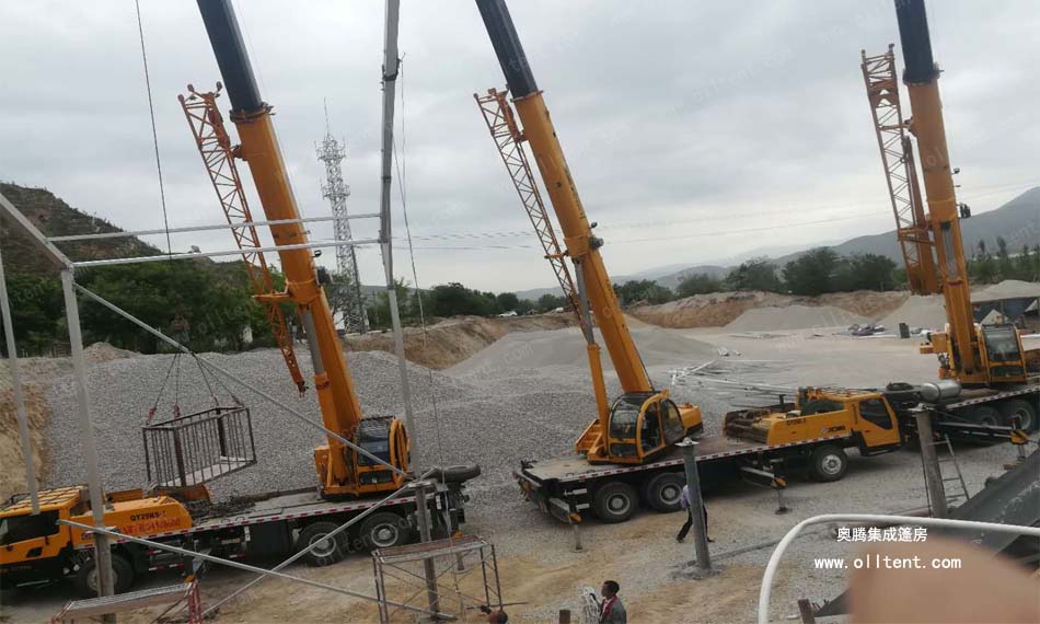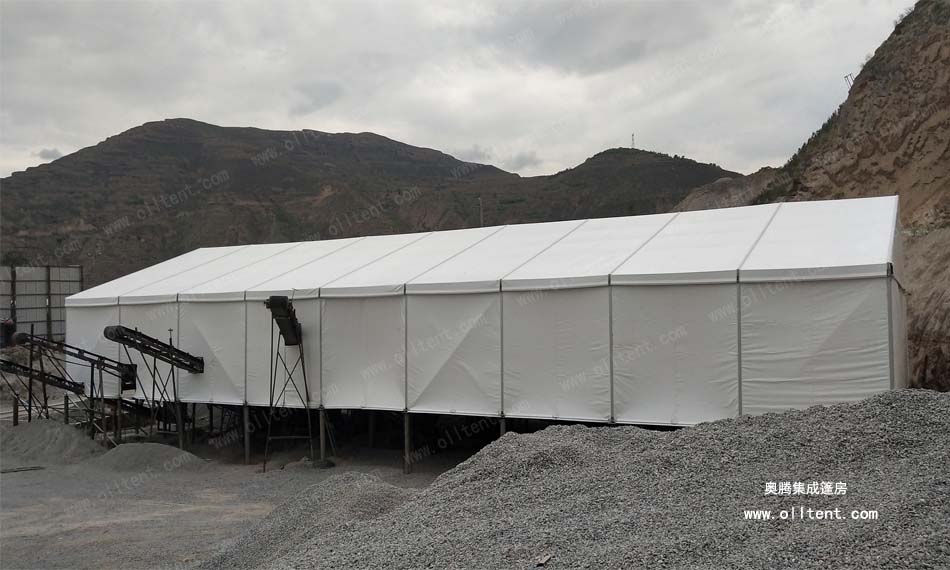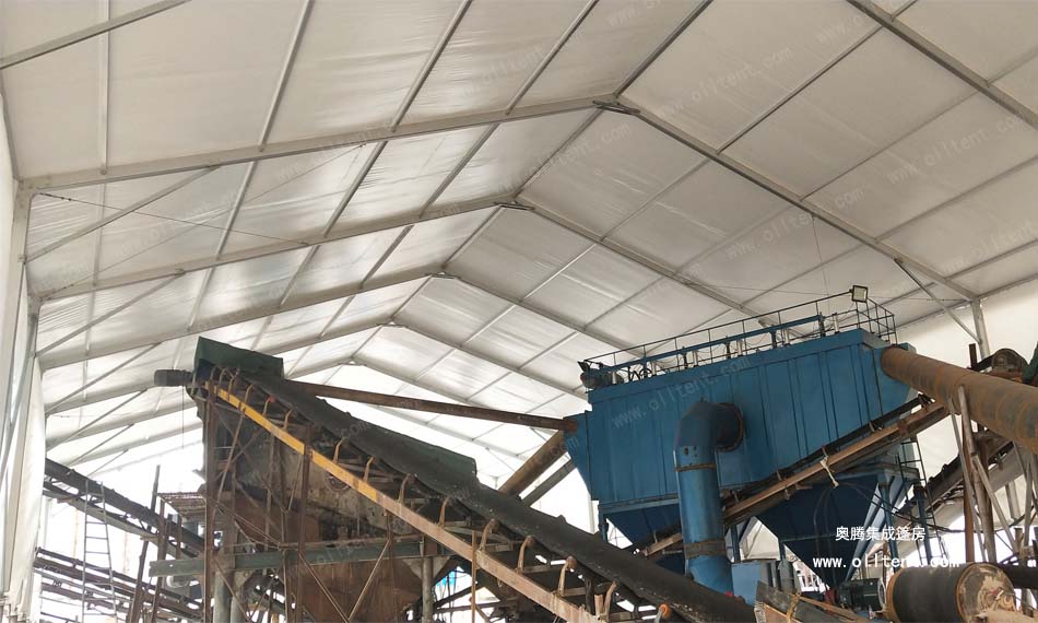 后來老板介紹道:“這是江蘇一家工廠研發出一種裝配式的廠房,跨度可達80米、長度無限延伸、高度10多米,能抗風載雪,材料也是高度符合環保要求。 如果不蓋棚子,這個灰到處飄,二十米內全都是灰,路上草上樹上地上,到處都是。長年累月積累下來的灰,相當驚人的。這樣做就把大部分灰留在了廠區,不至于飄灑的哪里都是。像我做這個石料行業的,開采地點會時常變更,堆積物料的卸貨點也會變更,這就要一個遮蔽物隨著工作地點的變化而變化。而我現在使用的這種裝配式篷房就能輕松實現,裝配式篷房就可以隨意搭拆,如果框架加上輪轂就可以實現篷房哪里需要哪里“走”。而且咱們也要積極樹立綠色治理理念,轉變思維,創新發展,為進一步提升全市的生態環境治理和空氣質量提升做出更大貢獻。”看來這位老板不僅會做生意,也非常有“覺悟”的!