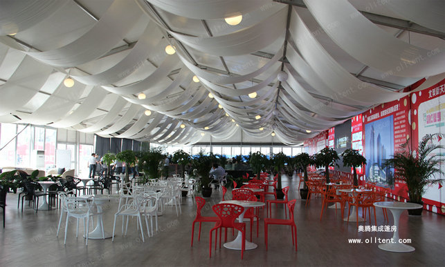 大型篷房還有多種可供選購的配置,使篷房的用途和功能更加強大。例如:ABS墻體、三明治墻體、彩鋼瓦墻體、玻璃幕墻、透明頂、頂幔布幔內飾、排風扇、卷簾門、玻璃門、承重盤承重框、地板系統、排水槽等