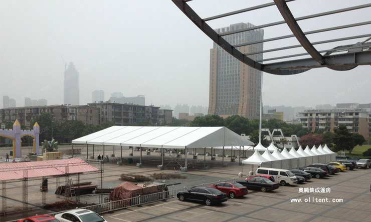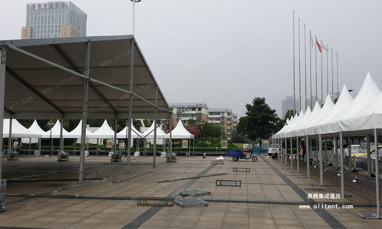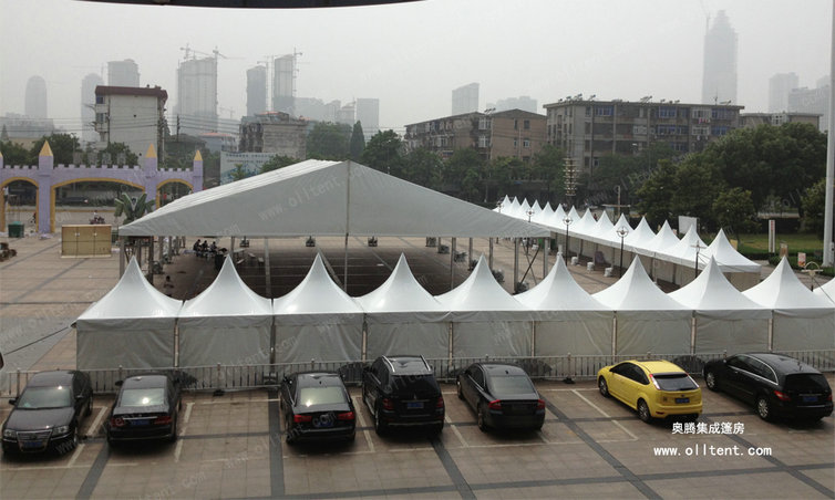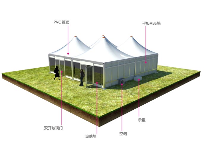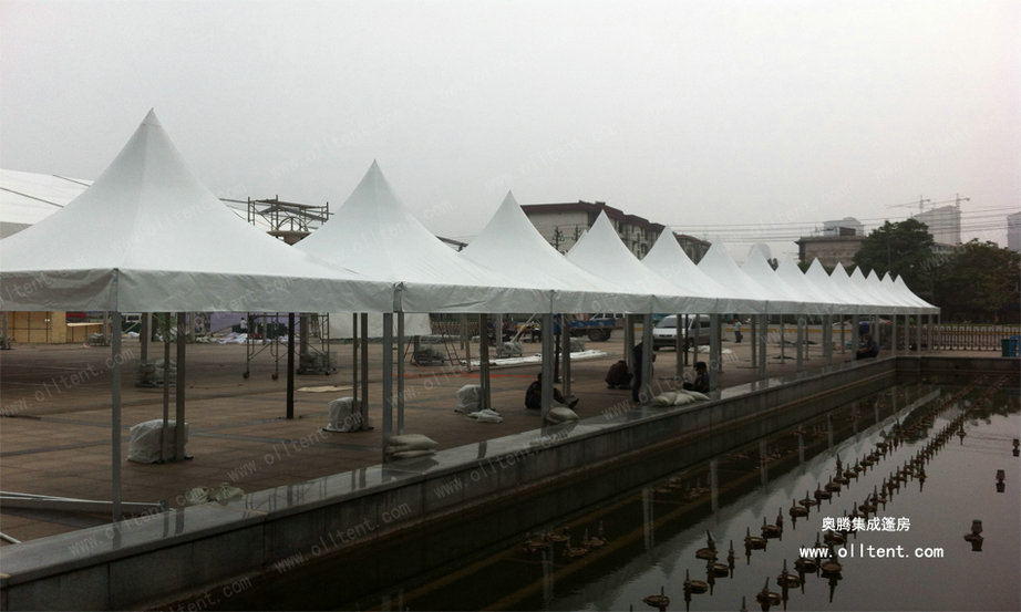 尖頂篷房優雅,堅固,潮流,搭建工期短,易于組裝和拆卸。新錐頂篷固定方式,已獲得設計專利證書,新的固定方式,不但大大減少了組裝時間,很好的防止滑出。無需大型機械協助,單個也可用排水槽連接起來組成更大的面積,形成特殊的造型。