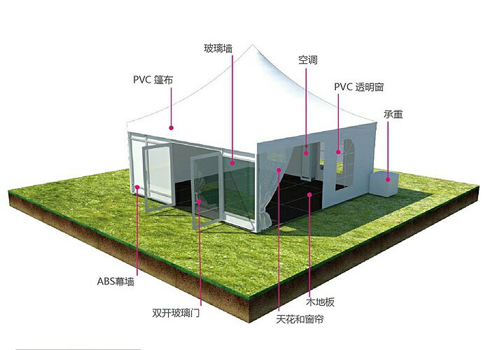 尖頂帳篷有多種可供選購的配置,例如:玻璃墻體、玻璃門、木地板、地錨釘和天花內飾等。錐頂帳篷除了用單獨使用外,還可以將它用排水槽連接起來組成更大的面積,形成獨特的造形,在戶外活動應用中更加精彩。